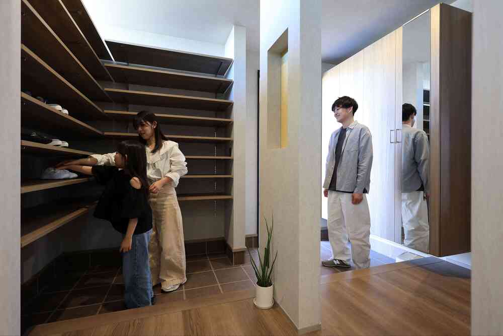 【3枚目の写真】大人5人が暮らす家ということもあって、玄関には豊富な収納スペースを設けました。家族が使う玄関を生活動線に直結させ利便性を高める工夫をしています。