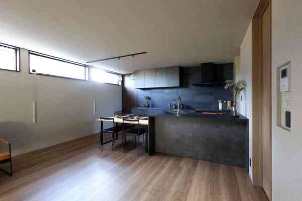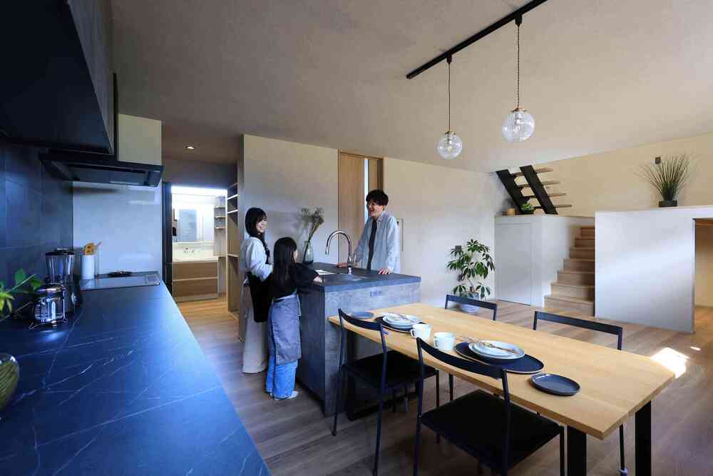 【4枚目の写真】ダイニングキッチンは、グラフテクトのキッチンを中心に黒を基調にした空間です。大人5人の落ち着いた生活に馴染むような、高級感のある引き締まった空間になりました。