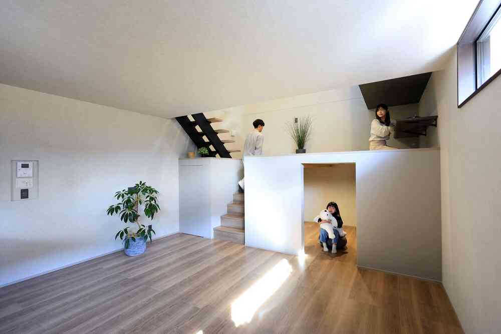 【6枚目の写真】リビングの奥は吹き抜けになっています。1階と2階の間に中二階のようなスキップフロアを設け、その下をヌックとして生かすことで、わくわくするような空間が出来上がりました。