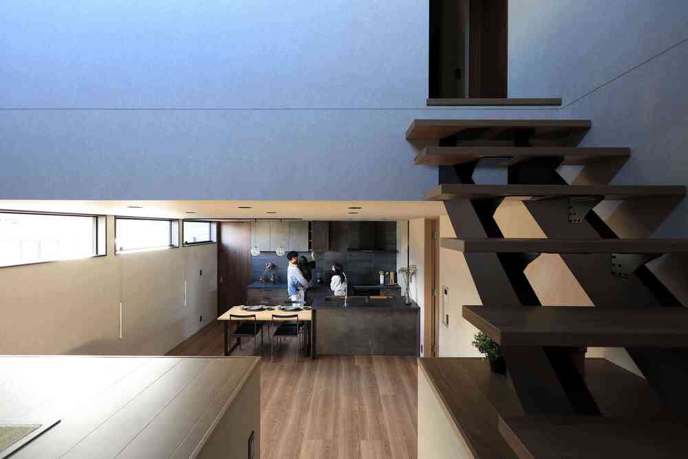 【8枚目の写真】スキップフロアに座りLDKをながめると、家族のゆるやかなつながりを感じられます。いろいろな場所にひとりでくつろげる場所を設けることで、家族がほど良い距離感を保ちながらひとつの場所で過ごせる空間を作りました。